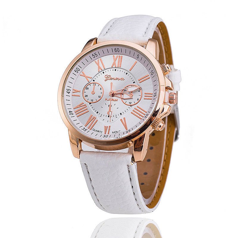 Predám nové dámske analógové hodinky zn. Geneva, ciferník priemeru 4 cm obsahuje tri malé imidžové ciferníky, okraje ciferníka vo farbe ružové zlato, farba ciferníka a remienka je rovnakej farbe, na výber farby: biela a béžová, dĺžka koženého remienka 23 cm.