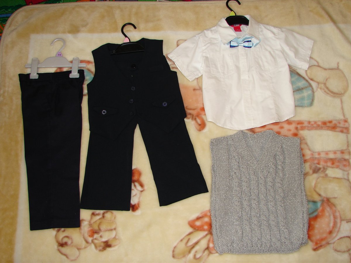 Predám chlapčenské nohavice (tmavomodré), nohavice s vestičkou (tmavomodré), košeľu s krátkym rukávom (bielu) s modrou mašličkou a pletenú sivú vestu pre chlapca s výškou do 104 cm. Spolu za 7 € + poštovné.